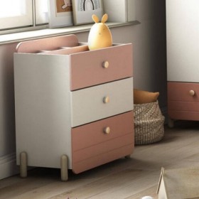 • ESTRUCTURA EN MADERA LAMINADA.• 3 CAJONES CON TIRADORES TEMÁTICOS.• ACABADOS DE ALTA CALIDAD.• COLOR: BLANCO MATE/GRIS CLARO/ROSA MATE.
