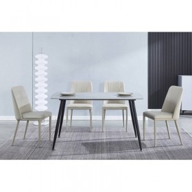 PAQUETE COMPUESTO POR:• MESA COMEDOR FIJA SANDERCOLOR: TAPA DE CERÁMICA CON PATAS NEGRAS.MEDIDAS: Ancho 140 x Alto 76 x Fondo 80cm • 4 SILLAS ROWENACOLOR: TAPIZADO EN PIEL SINTÉTICA TORTORA CON PATAS METÁLICAS.